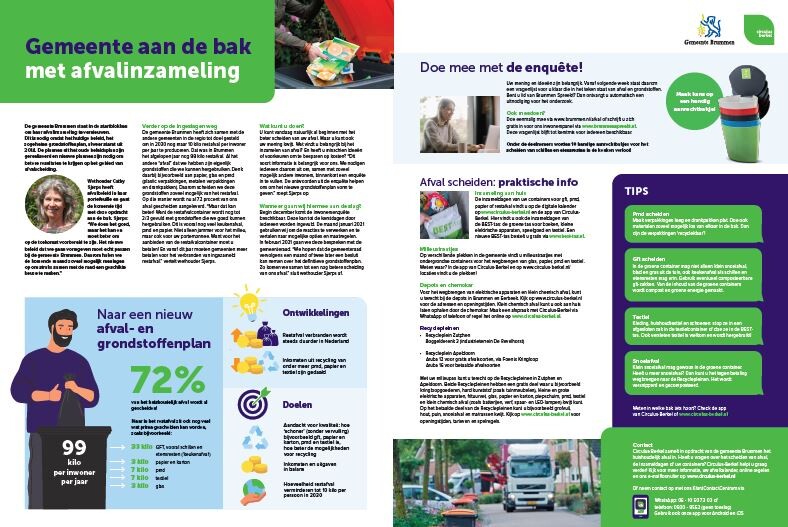 Op de pagina's leest u onder meer een interview met wethouder Cathy Sjerps. Zij vertelt waarom er aan een nieuw beleid wordt gewerkt. U leest ook over de enquête over afval en grondstoffen die in december gehouden wordt. Daarnaast biedt de pagina praktische info en tips! Klik op de afbeelding om de pagina's te openen.
