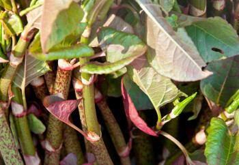 - In april komt de Japanse Duizendknoop uit de grond met kleine rode knoppen en blaadjes.