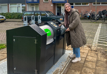 Woensdagmiddag 1 november neemt buurtbewoner Arzu Cinni de eerste container in de Rivierenwijk officieel in gebruik. ‘Ik ben er heel erg blij mee’, lacht ze. ‘En met mij veel meer bewoners. Fijn dat Circulus en de gemeente dit hebben opgepakt; ik kan nu sneller mijn restafval weggooien zonder dat het me extra geld kost.’