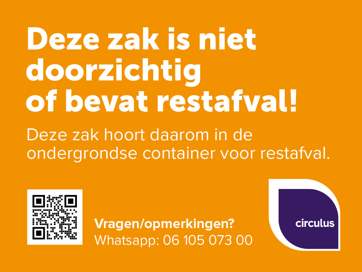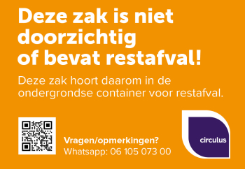 Woont u in de binnenstad of in een van de wijken in hoogbouw? Dan zet u uw PMD op de inzameldagen aan de straat of op een verzamelplek in doorzichtige zakken. De zakken moeten voor 07.30 uur worden aangeboden, dan beginnen de Circulus-medewerkers aan hun route. Zakken die niet doorzichtig zijn worden niet meegenomen. We kunnen dan namelijk niet zien of er alleen PMD in zit. Ook zakken waarin duidelijk (rest)afval zit, laten de medewerkers staan. Ze plakken een sticker op de zak om bewoners op de hoogte te brengen.