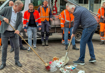 Met een bezem en een flinke schep laten de beide heren zien dat ze best een bijdrage kunnen leveren aan een schone binnenstad. ‘Maar jullie zijn natuurlijk echt degenen die het werk doen’, aldus de wethouder. ‘Dankzij jullie wordt de mooiste binnenstad van Nederland altijd opgeruimd. Daar zijn we bij de gemeente harstikke blij mee!’ Peter Brouwer voegt daaraan toe: ‘Alle ondernemers zijn blij met jullie. Als ik de komende dagen de foto’s van vandaag deel op social media krijg ik heel veel duimpjes. Die zijn niet voor mij, maar voor jullie!’