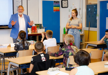 ‘Nou, dat ben ik’, lacht wethouder Jan Aalbers en legt vervolgens kort uit wat en wethouder doet. ‘En ik ben van afval en grondstoffen’, vervolgt hij. ‘Vroeger noemden we alles afval en gooiden alles wat we niet meer leuk vonden of niet meer nodig hadden in de grijze container. Dan werd het op een grote hoop gestort of verbrand. Dat doen we gelukkig niet meer. Want in afval zitten belangrijke grondstoffen, waar we nieuwe dingen van kunnen maken. Wisten jullie dat de gouden medailles van de Olympische Spelen zijn gemaakt van goud dat uit oude telefoontjes is gehaald? Ik hop dat jullie heel goed je best doen en heel veel apparaten ophalen, want overal zit wel wat in. Dus ik wens jullie heel veel succes!’