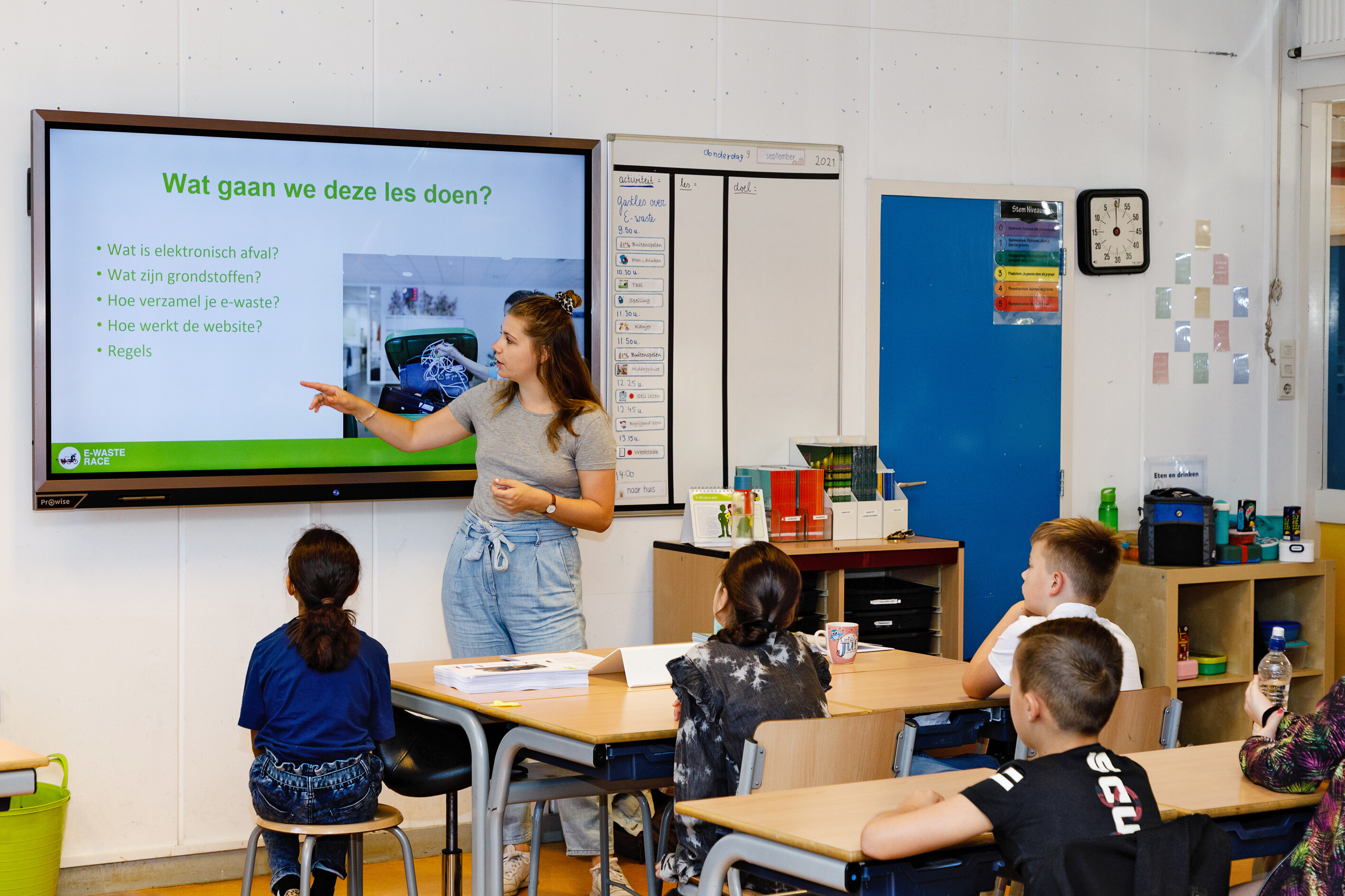 Juf Tessa legt de leerlingen van groep 7 uit dat zij wel heel speciaal zijn deze ochtend omdat de wethouder in hun klas de aftrap komt geven van de E-waste-Race. Dat leidt onmiddellijk tot een vraag: ‘Wat is een wethouder?’