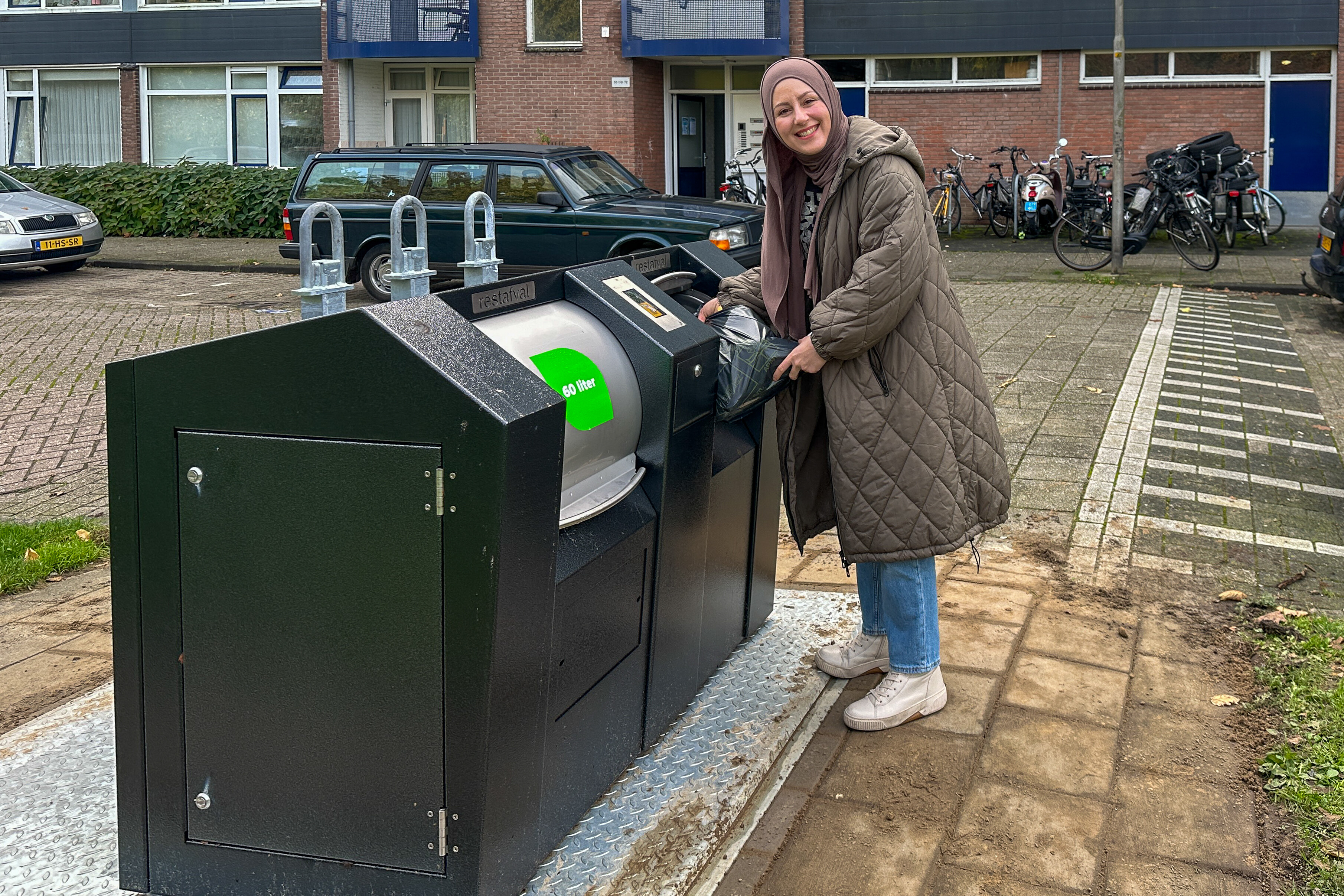 Woensdagmiddag 1 november neemt buurtbewoner Arzu Cinni de eerste container in de Rivierenwijk officieel in gebruik. ‘Ik ben er heel erg blij mee’, lacht ze. ‘En met mij veel meer bewoners. Fijn dat Circulus en de gemeente dit hebben opgepakt; ik kan nu sneller mijn restafval weggooien zonder dat het me extra geld kost.’