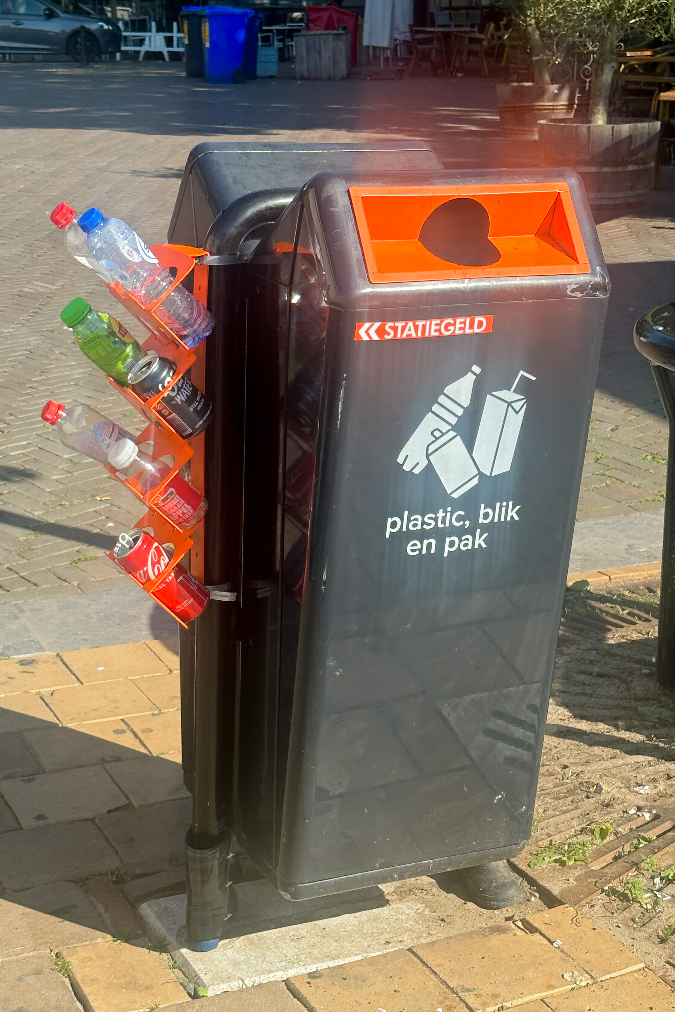 Als mensen de blikjes en flesjes niet inleveren, maar wel kwijt willen, kunnen ze ze in een van de pmd-oranje rekken plaatsen. Mensen die het geld goed kunnen gebruiken hoeven niet meer in de afvalbakken te zoeken en kunnen zo op een waardige manier de flesjes en blikjes meenemen en inleveren. Goed voor het milieu, want nu worden ze gerecycled en het levert ook nog minder zwerfafval op.