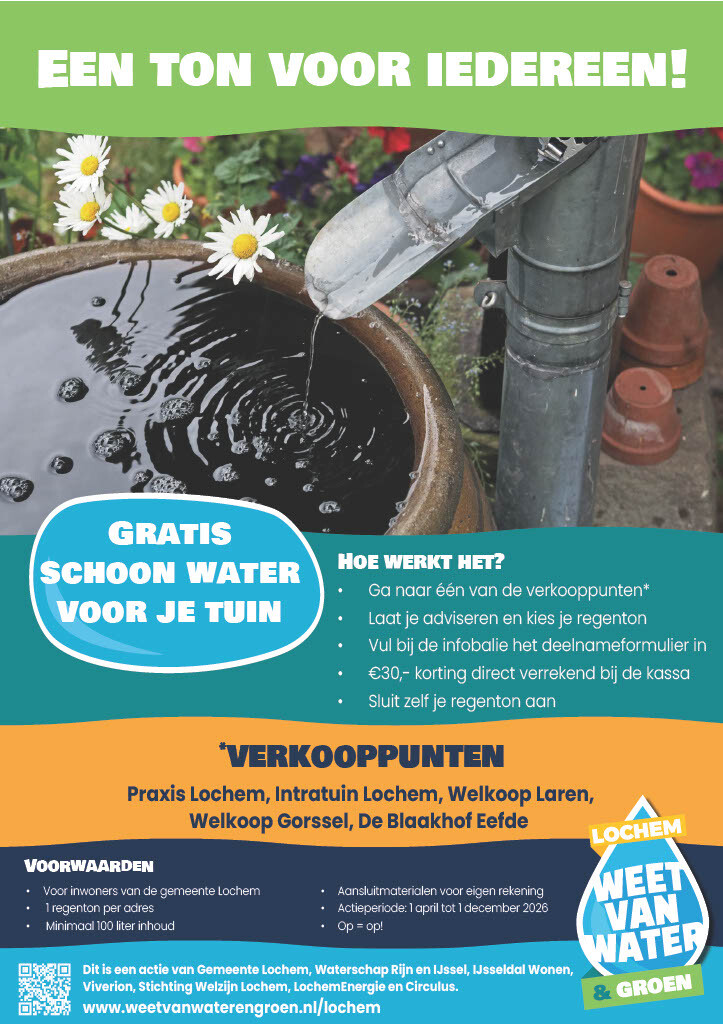 Van 1 april tot 1 december 2026 kunnen inwoners van de gemeente Lochem met € 30 korting een regenton aanschaffen. In totaal zijn 200 tonnen beschikbaar. Op = op! Bekijk de nieuwspagina voor meer informatie, de verkoopadressen en voorwaarden.