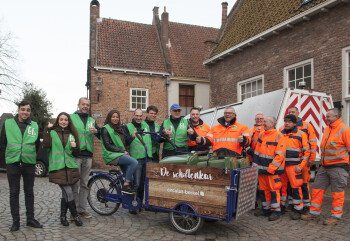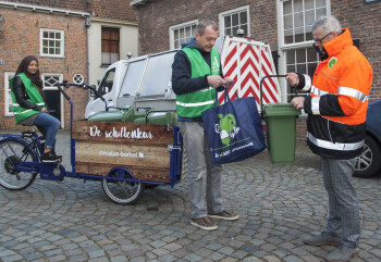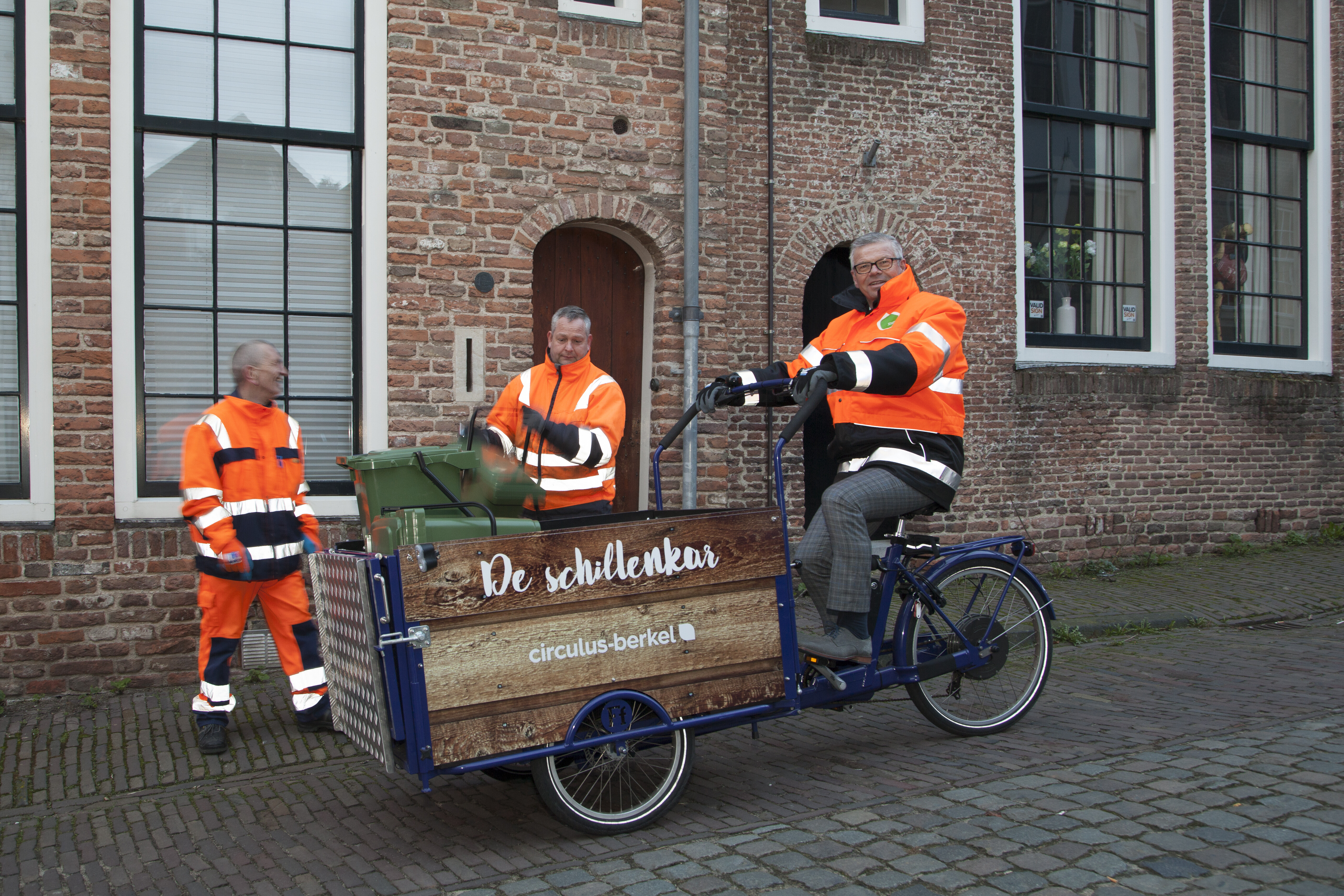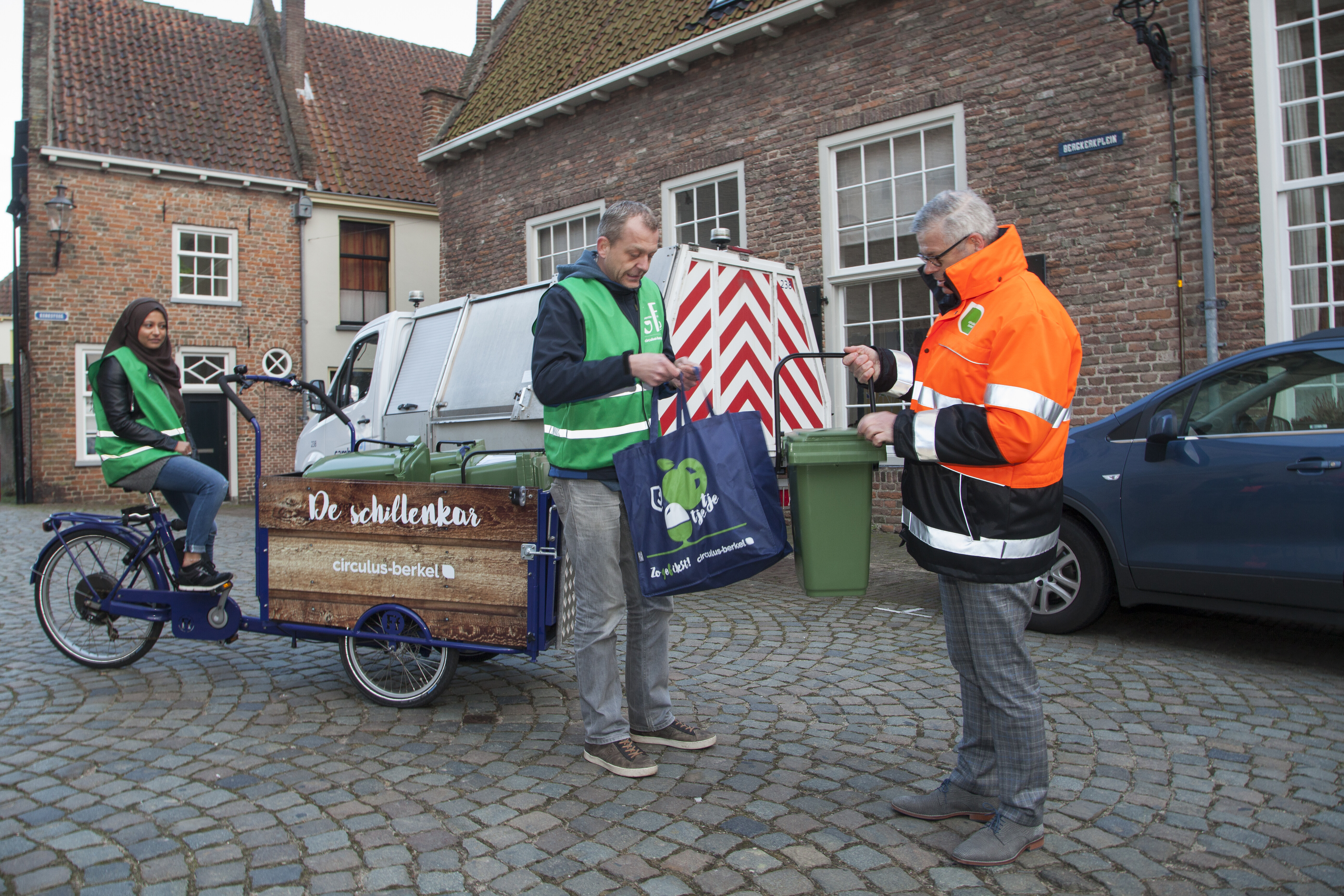 De gemeente en Circulus-Berkel streven naar een nog betere afvalscheiding door groente- en fruitafval apart in te zamelen. Een derde van het restafval in Nederland bestaat namelijk nog uit groente- en fruitafval. De vraag is o.a. waarom mensen nog zoveel GF in het restafval gooien. ‘Elke gemeente worstelt om die laatste 25% uit het restafval te halen en is aan het experimenteren’, vertelt wethouder Frits Rorink. ‘In Deventer proberen we dat via dit schillenkar-pilot.’ Om de officiële start daarvan te markeren, gingen de wethouder en adjunct-directeur Huub Vervoorn van Circulus-Berkel symbolisch met een ouderwetse schillenkar en het DSF-team langs de deuren in het Bergkwartier om bewoners te vragen deel te nemen aan de pilot. De proef duurt tot het einde van het jaar.