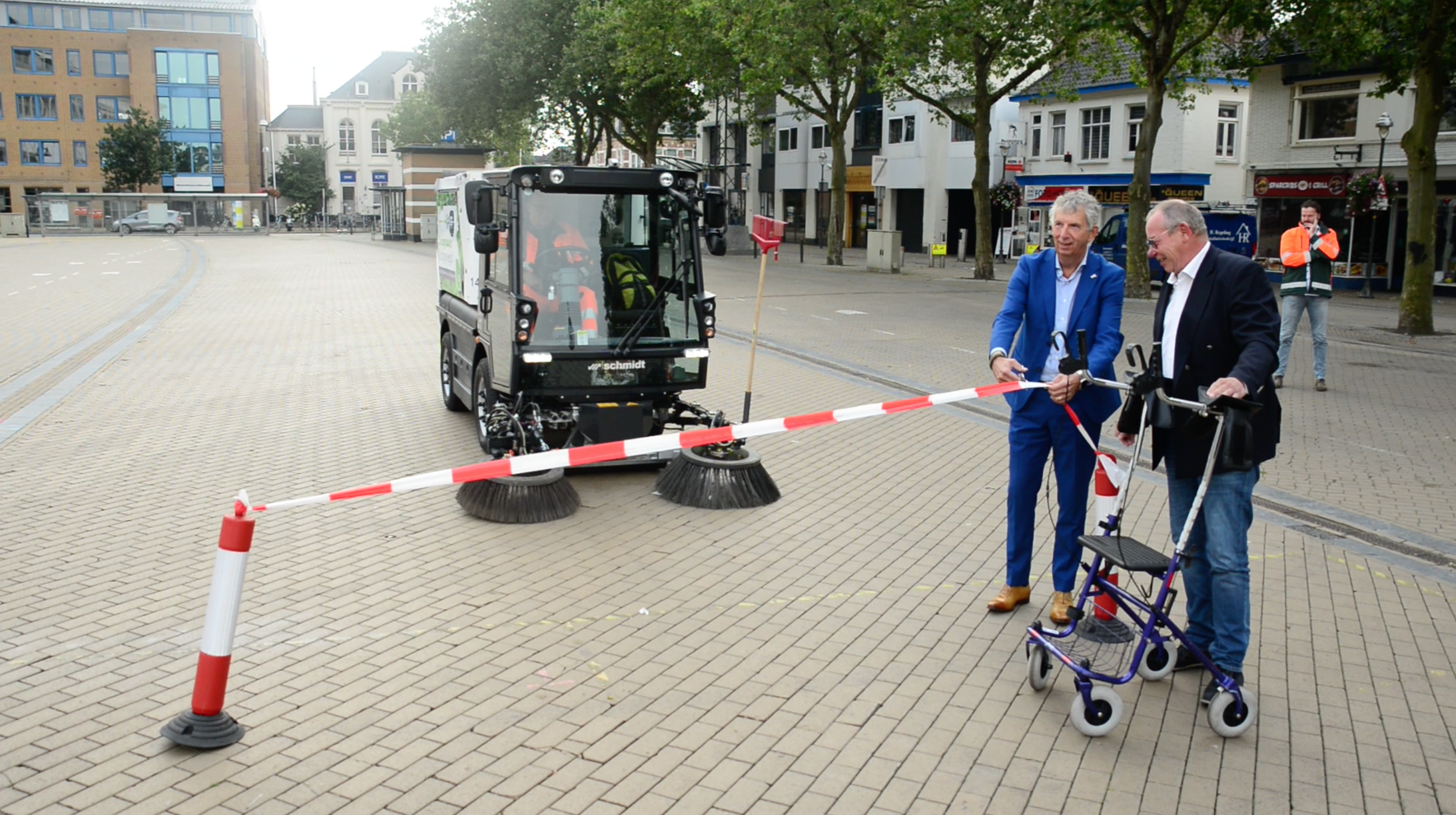 Machinist Toon Achterkamp startte zijn veegroute op het Marktplein richting de Markstraat. Voordat de emissievrije wagen deze ‘klimaatstraat’ in kon rijden knipte wethouder Detlev Cziesso samen met onze adjunct-directeur Huub Vervoorn een lint door. Daarmee kreeg de machine een warm welkom in de stad. De wethouder liet weten erg blij te zijn met de verdere elektrificering van het wagenpark, een ontwikkeling die de gemeente ook voor het eigen materieel inzet.