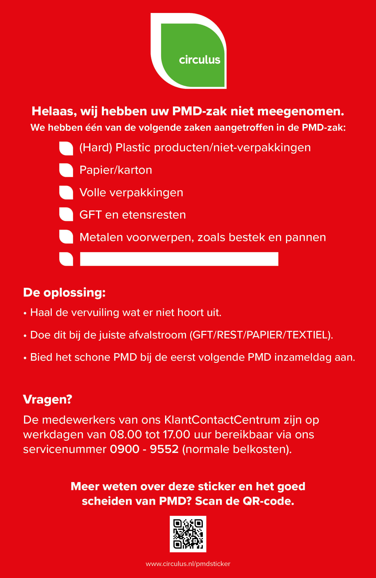 Als er een rode sticker zit op uw PMD-zak, dan zit er vervuiling in. De sticker geeft aan welke vervuiling uit de zak gehaald moet worden. Bijvoorbeeld hard kunststof, GFT of etensresten of volle verpakkingen.