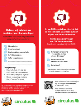 Hoe beter PMD gescheiden wordt, hoe meer er kan worden hergebruikt. Jammer genoeg zien we in het PMD ook zaken die er niet thuis horen. Dat verstoort de recycling en leidt tot afkeur van PMD. Afgekeurd PMD wordt verband als restafval: slecht voor het milieu en een stuk duurder dan recyclen. Om de verstoring tegen te gaan controleert Circulus de PMD inzameling.