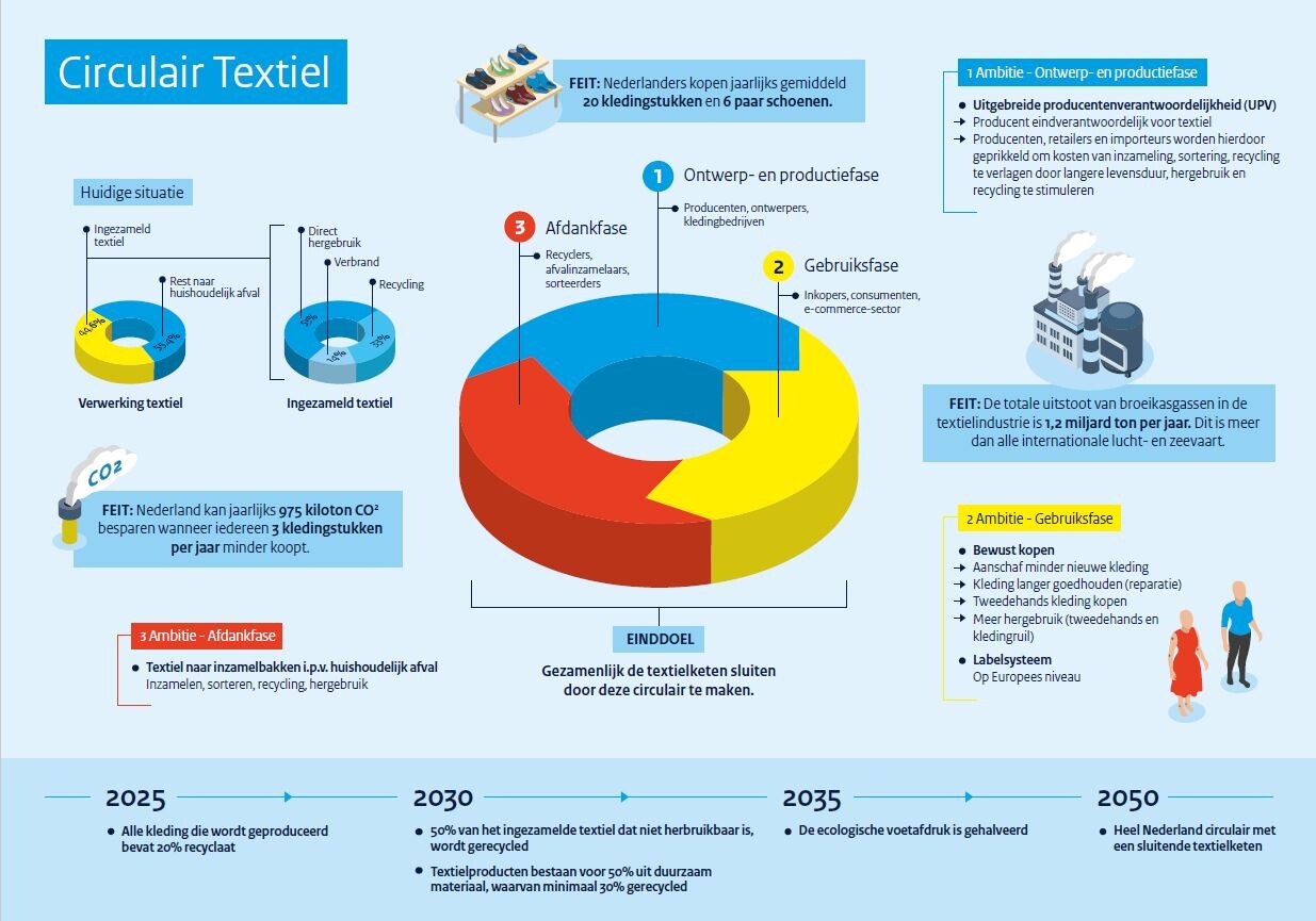 Ieder jaar belandt nog 9 kg textiel per persoon bij het restafval. Met het inleveren van textiel voorkomen we het verlies van kostbare vezels aan de verbrandingsoven. Bovendien besparen recycling en hergebruik de energie, het water en het gebruik van chemische stoffen die nodig zijn voor het vervaardigen van nieuw textiel. Achtergrondinformatie in de vorm van visuals vind je als PDF en als plaatje hieronder. Uitgave: CirkelWaarde/Circulus.